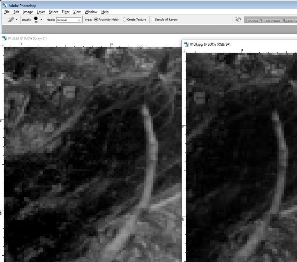 It would be a fascinating exercise to rescan from the original negatives with a more current scanner in order to compare changes in technology (and operator skills), but this would be a technical adventure that tells another story. This story might include the information told by the image metadata – that on the 28th Oct 2017 (and at 1.28pm, all assuming the computer time was accurate) the image was processed by Photoshop CS4 on a mac. This metadata might reference some reworking of the images but it indicates how evidence can be lost over time.
