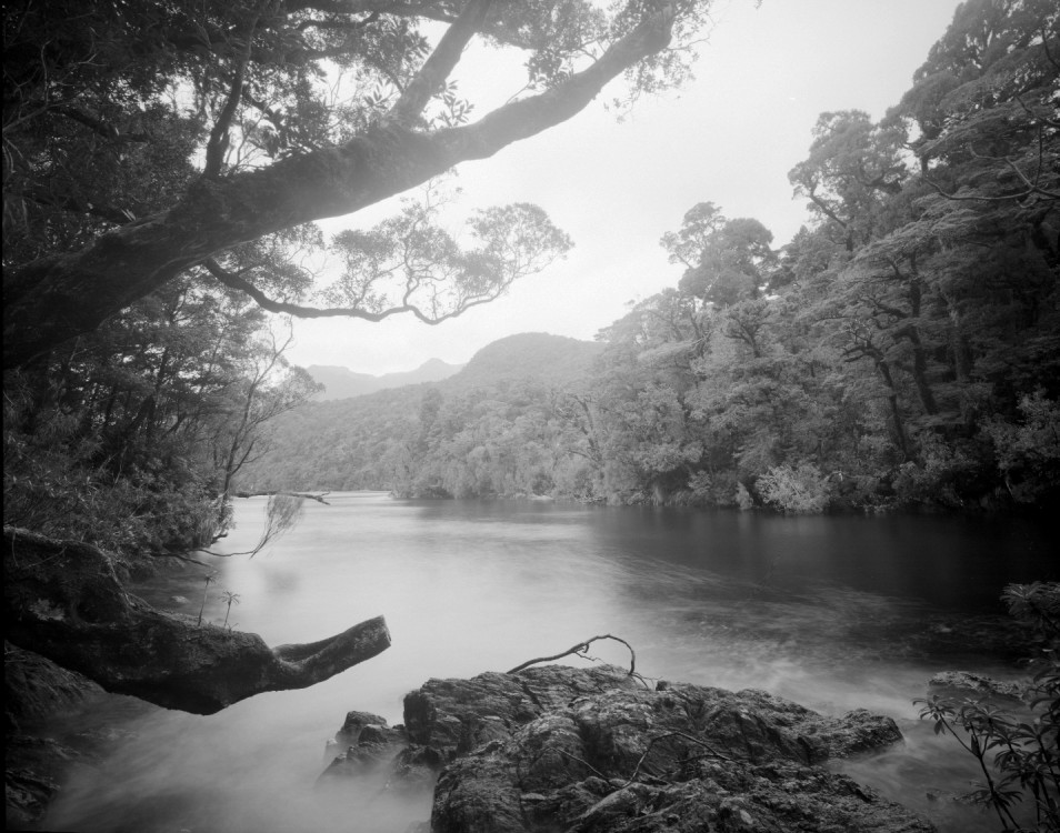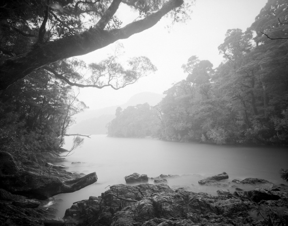 Sameshima informs that he was photographing in Dusky Sound, Fiordland in the South Island with an 8×10 camera on tripod for two days. The incoming tide caused him to have to relocate several times.